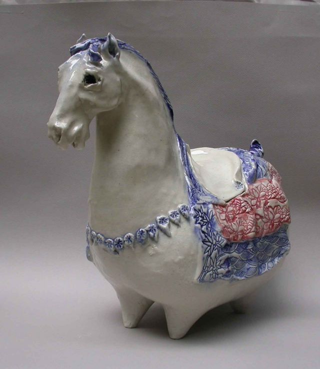 The pieces in this exhibition are also influenced by the Tang Dynasty horse sculptures I have seen in China. These horses stand erect with decorative elements, some with saddles that can be removed, almost all with ears pricked and mouth open. During the Tang Dynasty there was a rise in popularity of Buddhism and an associated emancipation of women. Women rode astride, playing and fighting alongside their men.